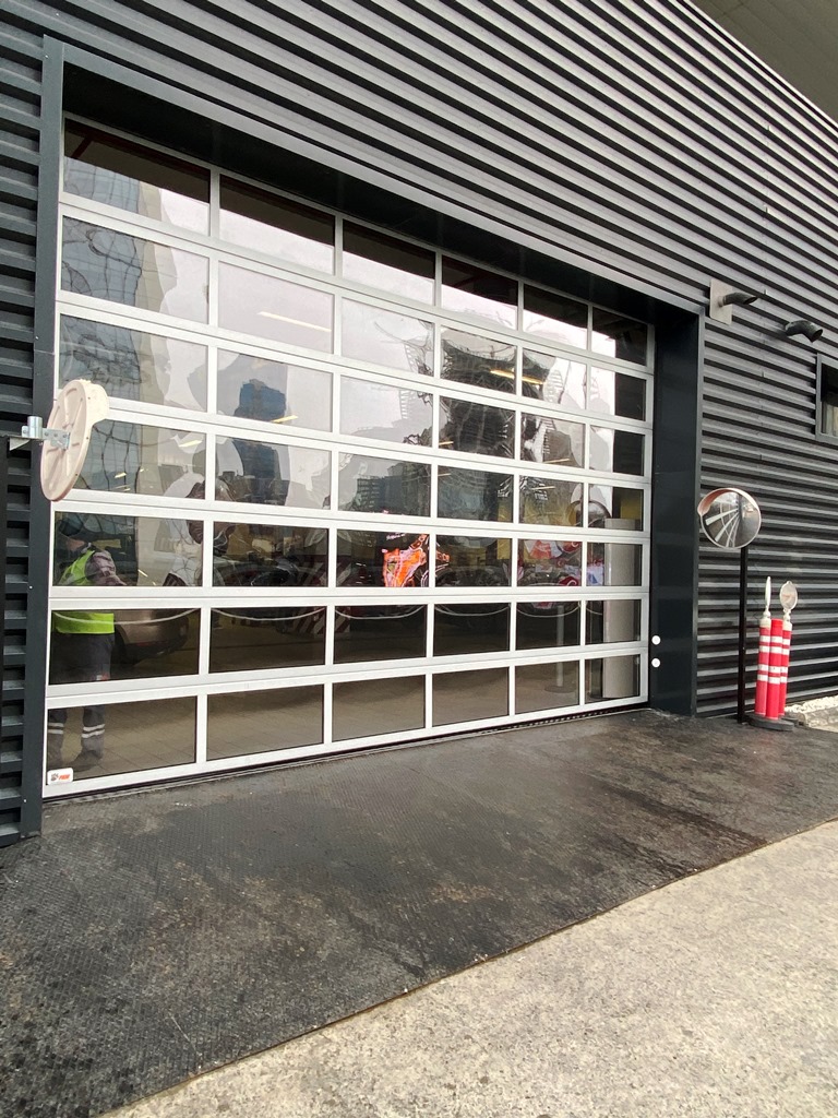 Full-view sectional doors are durable, long-lasting, and designed to offer fast and secure entry/exit, making them an ideal solution for modern businesses where aesthetics and functionality are key—particularly in automotive showrooms and factory entrances.